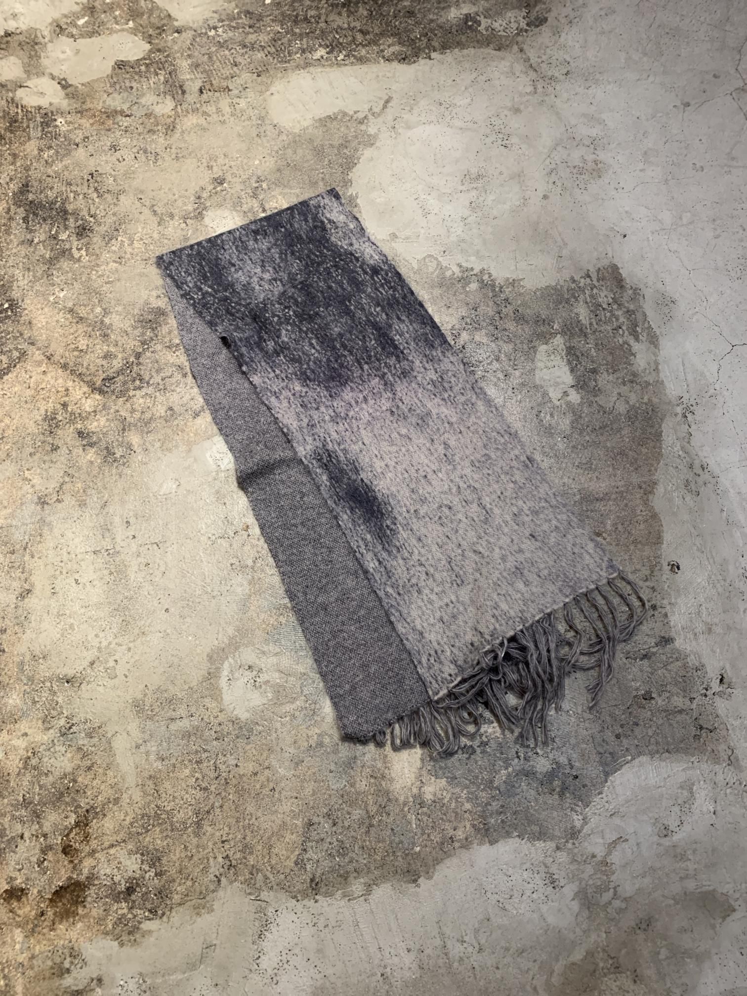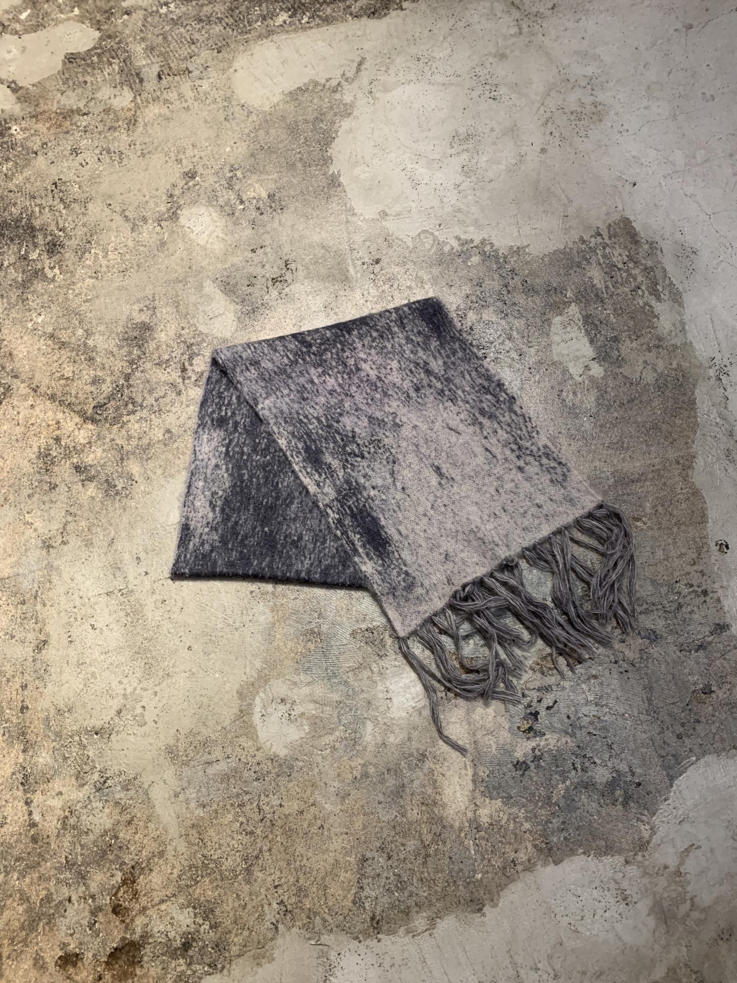 柄は鉄板を野晒しにして雨、風、日差しにより経年変化させて錆ついた鉄錆模様をジャガード編みで表現、最後に起毛をかける事により境目がぼやけて独特の左右非対称の模様が特徴的な1枚。